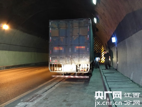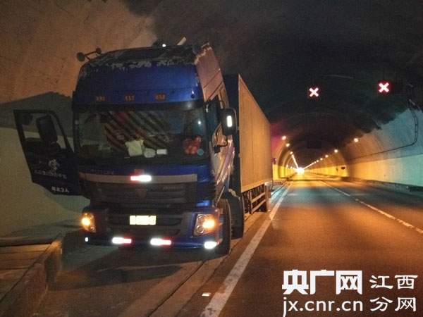 央廣網(wǎng)南昌3月8日消息(吳昊)3月5日16時許,江西高速交警直屬八支隊第四大隊民警,自廈蓉高速公路瑞贛段,瑞金往贛州方向巡邏時,在369km于都東隧道內,發(fā)現(xiàn)一輛重型貨車正?吭诤诎档膽蓖\噹龋嚿砗蠓轿丛O置任何警告標志。由于車身較為龐大,貨車的一側幾乎是緊挨著行駛車道的。當時車流量較大,而且隧道內的道路更為狹窄,一輛輛駛過的汽車,因未能提前知曉該貨車?坑诖,都與該貨車“擦肩而過”,十分危險。