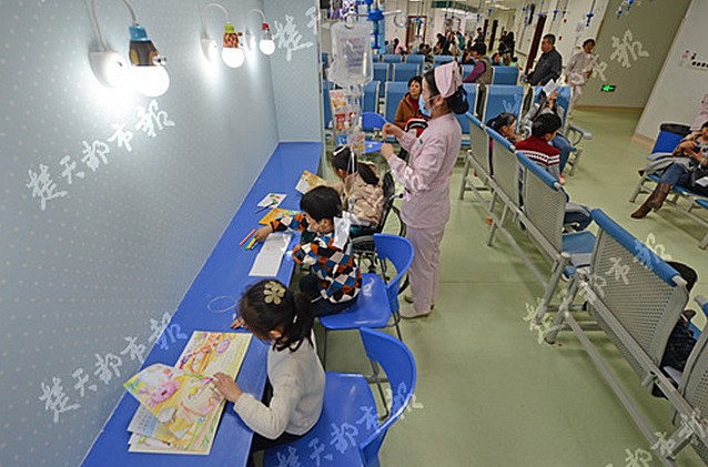 在一排可愛的驢頭護(hù)眼燈下,幾名小朋友掛著吊瓶端坐在輸液室的一角,趴在桌前或閱讀或做作業(yè)……這是武漢市第三醫(yī)院光谷院區(qū)兒科門診內(nèi)的一幕。今天,該院在武漢率先開設(shè)兒科輸液室書香一角,方便學(xué)生打針時兼顧學(xué)習(xí),堪稱醫(yī)院里的“吊瓶班”。