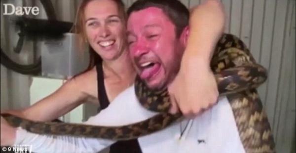 據(jù)英國(guó)《每日郵報(bào)》8月25日?qǐng)?bào)道,英國(guó)蟲(chóng)害防治員克雷格 弗里曼在澳大利亞錄制一檔真人秀節(jié)目時(shí)被一條巨蟒繞頸,無(wú)法脫身,其美女搭檔凱莉當(dāng)即施以援手,幫他脫險(xiǎn)。