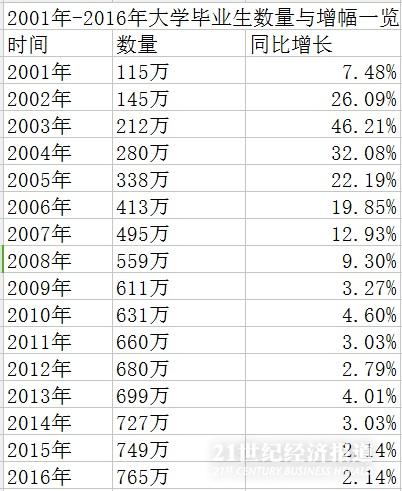 他的感覺在某種程度上是對的,大學生的“稀缺性”正在不斷降低。2016年10月份,又一輪大四新生將步入找工作的大軍中。這些在2017年即將畢業(yè)的大學生,預估總人數(shù)仍然超過700萬。事實上,從數(shù)據中可以看出,從上世紀末開始的大學生數(shù)量快速增長,目前已經明顯放緩至年增幅不足3%,但總基數(shù)已經到了非常巨大的地步。