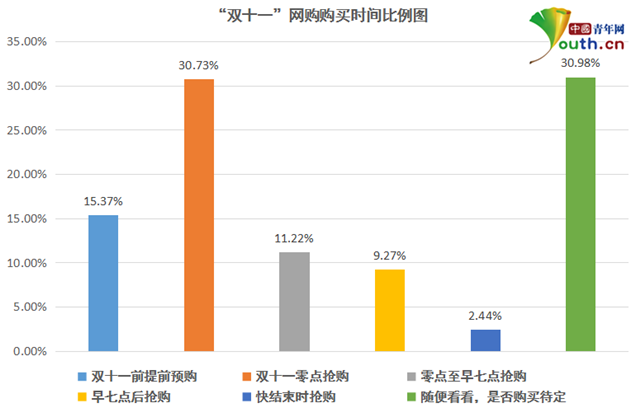 根據(jù)中國(guó)青年網(wǎng)調(diào)查數(shù)據(jù)顯示,在網(wǎng)購(gòu)時(shí)間上,30.73%的學(xué)生選擇“雙十一”零點(diǎn)搶購(gòu),其次為提前預(yù)購(gòu)和零點(diǎn)至早七點(diǎn)搶購(gòu),分別占15.37%、11.22%。另外,有30.98%的學(xué)生選擇隨便看看,是否購(gòu)買待定。這說明,多數(shù)大學(xué)生決定在“雙十一”期間進(jìn)行搶購(gòu),消費(fèi)動(dòng)機(jī)明確。