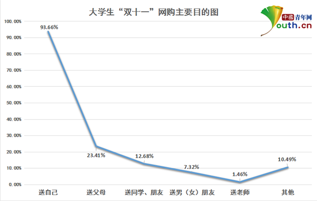 根據(jù)中國(guó)青年網(wǎng)調(diào)查,大學(xué)生網(wǎng)購(gòu)目的多元化,93.66%的網(wǎng)購(gòu)大學(xué)生是為自己進(jìn)行網(wǎng)購(gòu),其次是為送父母和送同學(xué)朋友,各占23.41%、12.68%。