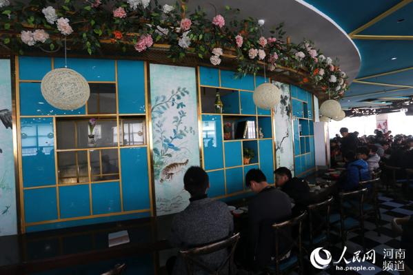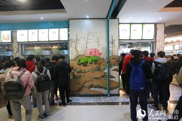 2月26日,在河南鄭州華北水利水電大學(xué),記者看到,學(xué)生們排隊在裝扮一新的學(xué)校食堂里就餐。曾經(jīng)的硬座桌凳換成了軟座桌椅,屋頂以星空為主題背景,獨特的燈飾造型,十二星座圖案,山水、動物、人物繪畫,池塘里游來游去的金魚、蓮藕將環(huán)境布置的十分溫馨、雅致,炫美。