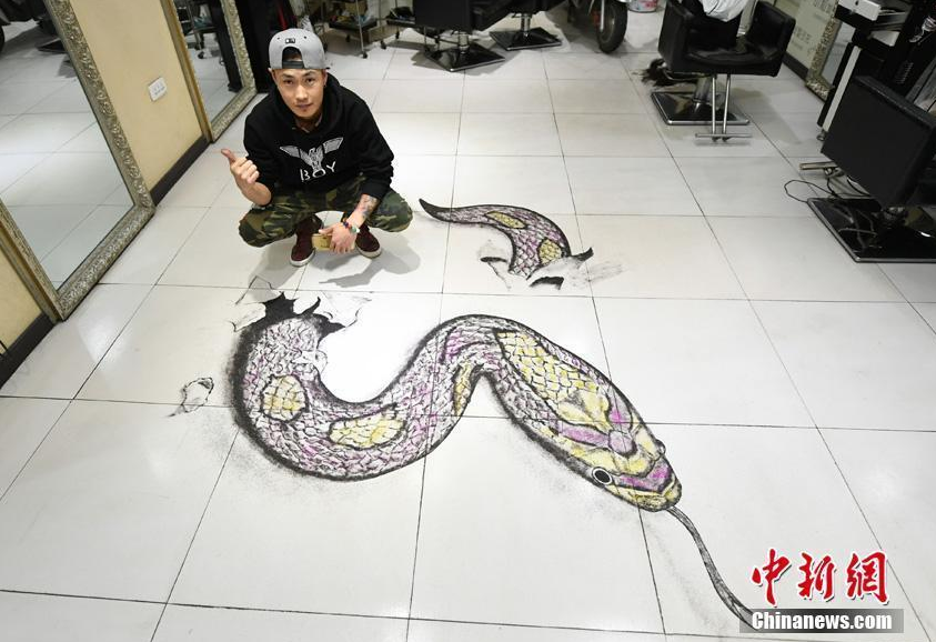 4月18日,吉林市“85后”發(fā)型師王小玖用頭發(fā)制作3D畫,呼之欲出的3D蛇畫得栩栩如生。據(jù)悉,王小玖從2016年7月開始用頭發(fā)做畫,至今創(chuàng)作150余幅作品,還在做畫的時候進(jìn)行網(wǎng)絡(luò)直播,與粉絲互動,獲得近十萬粉絲。