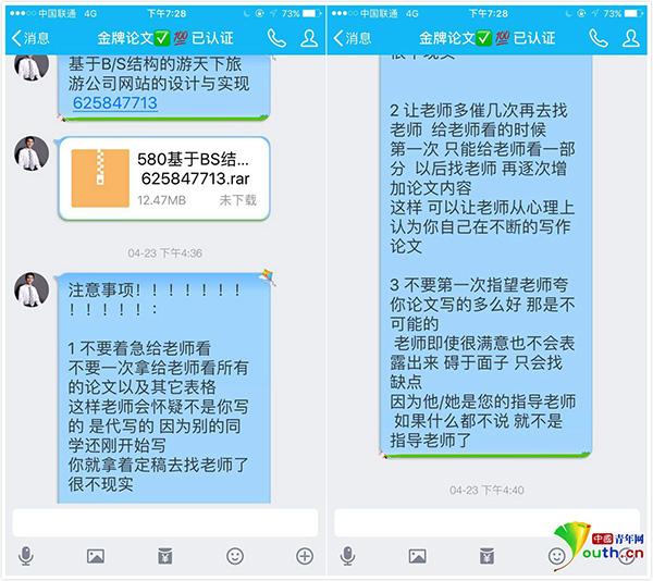 4月中旬,賣家“金牌論文”向張良介紹了“450元”、“550元”、“580元”三套論文代寫方案,其中550元包括“1封面+2論文+3系統(tǒng)+4源程序+5目錄+6中英文摘要翻譯+7文獻(xiàn)+8指導(dǎo)記錄表+9畢業(yè)設(shè)計(jì)檢查表+10原創(chuàng)性聲明+11畢業(yè)答辯陳述詞+12系統(tǒng)運(yùn)行演示錄像+12售后服務(wù) 答辯指導(dǎo)”,580元的服務(wù)增加了“開題報(bào)告”、“答辯稿PPt”、“文獻(xiàn)”、“配置安裝說明書”。賣家還稱,可以保證論文重復(fù)率不超過30%,如果團(tuán)購還有優(yōu)惠,“保證畢業(yè)設(shè)計(jì)隨時(shí)調(diào)試,永久有效”。