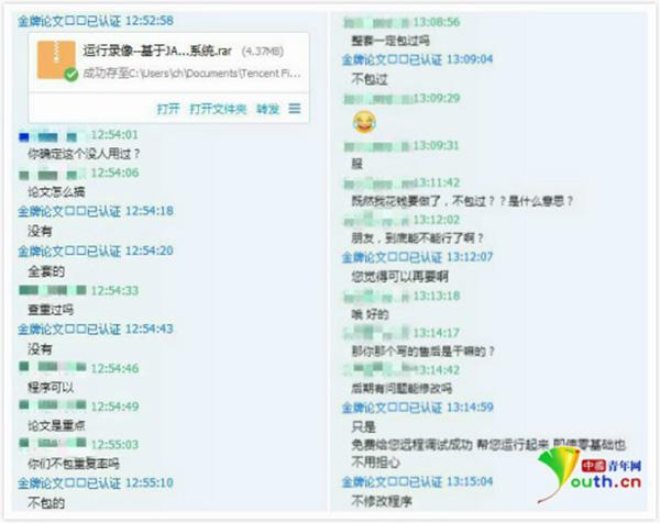 圖為張良提供聊天截圖。根據(jù)張良提供的信息,記者也添加了“金牌論文”QQ,以學(xué)生身份與其交涉,提出想做一套“在線點(diǎn)餐系統(tǒng)”的畢業(yè)設(shè)計(jì)!敖鹋普撐摹痹偃儐栍浾咚诘膶W(xué)校,而后透露他們的論文是買一套刪一套,絕對(duì)避免重復(fù),論文及畢業(yè)設(shè)計(jì)保證“自己原創(chuàng),獨(dú)一無二”!敖鹋普撐摹备嬖V記者,一般在淡季訂單少時(shí),完成新的論文;旺季時(shí)拿來賣,且論文寫作團(tuán)隊(duì)都是碩士和博士文憑。
