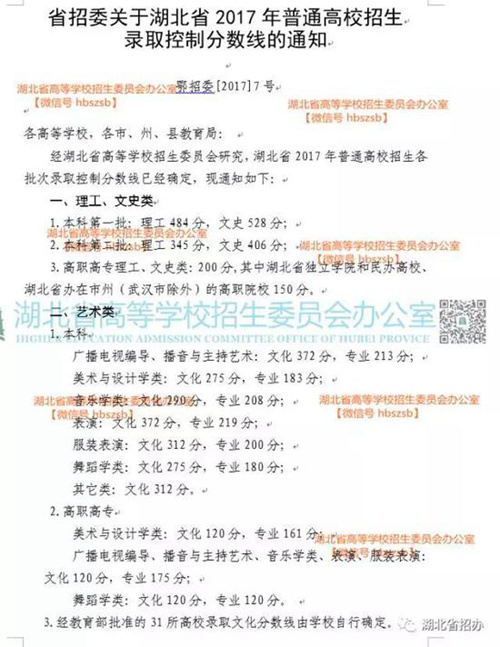 2017年湖北省高考各批次分?jǐn)?shù)線公布,具體如下: