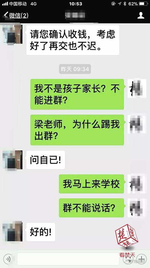 13日上午9時許,楊先生發(fā)現(xiàn)自己被班主任梁老師踢出了群。他私信問梁老師為什么,得到的回復是:“問自己!” 楊先生很氣憤,當天到學校找領導反映此事,并全程用手機拍下了視頻。