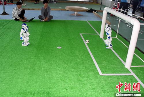 資料圖:2018年3月29日,廈門(mén)大學(xué)大學(xué)生創(chuàng)新創(chuàng)業(yè)實(shí)踐基地,大學(xué)生團(tuán)隊(duì)演示他們研發(fā)出的機(jī)器人足球。 中新社記者 孫自法 攝