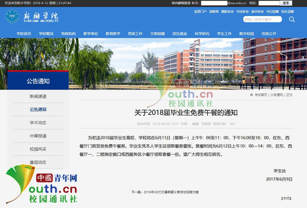 記者在該校官方網(wǎng)站看到,在公告通知一欄,該校學生處于6月9日發(fā)布了《關于2018屆畢業(yè)生免費午餐的通知》,通知內(nèi)容為:為歡送2018屆畢業(yè)生離校,學校將在6月11日(星期一)上午9:00至11:00,下午16:00至18:00,在東、西餐廳門前發(fā)放免費午餐券。畢業(yè)生憑本人學生證領取餐券壹張。就餐時間為6月12日上午10:00—14:00,在東、西餐廳一、二樓指定窗口或西服務區(qū)小餐廳領取套餐一份。望廣大師生相互轉告。
