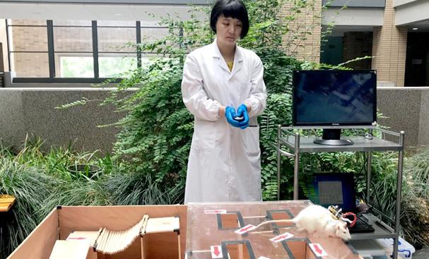 浙江大學(xué)求是高等研究院老師俞超楠演示通過微電刺激大鼠的感覺皮層產(chǎn)生虛擬觸覺實(shí)現(xiàn)對(duì)大鼠機(jī)器人轉(zhuǎn)向行為的控制。(謝沂楠攝)