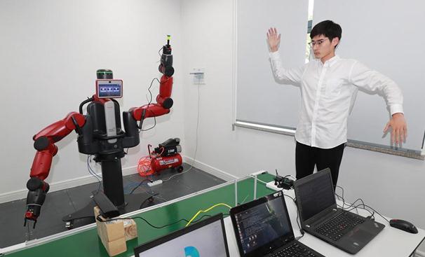 浙江工業(yè)大學(xué)計(jì)算機(jī)科學(xué)與技術(shù)學(xué)院(軟件學(xué)院)學(xué)生朱文成演示實(shí)時(shí)控制協(xié)作機(jī)器人。(樊世剛攝)