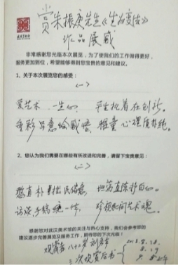 十年間,劉務(wù)本給武漢美術(shù)館大大小小的畫展寫了近百條留言,其原則是“取共性,存異性,尊重藝術(shù)家的人格和風(fēng)格!币?yàn)檎嬲\(chéng)獨(dú)到的點(diǎn)評(píng),她在武漢藝術(shù)圈也小有名氣,藝術(shù)家陳立言、謝申等曾親自到她家中拜訪交流。