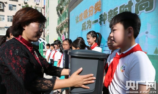 回民小學鮑宇紅校長為學生代表發(fā)放垃圾分類桶(央廣網發(fā) 學校供圖)