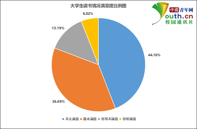 調(diào)查顯示,有44.1%的受訪學(xué)生對(duì)自己讀書情況不太滿意,36.69%的受訪學(xué)生基本滿意,認(rèn)為非常不滿意和非常滿意的分別為13.19%和6.02%。