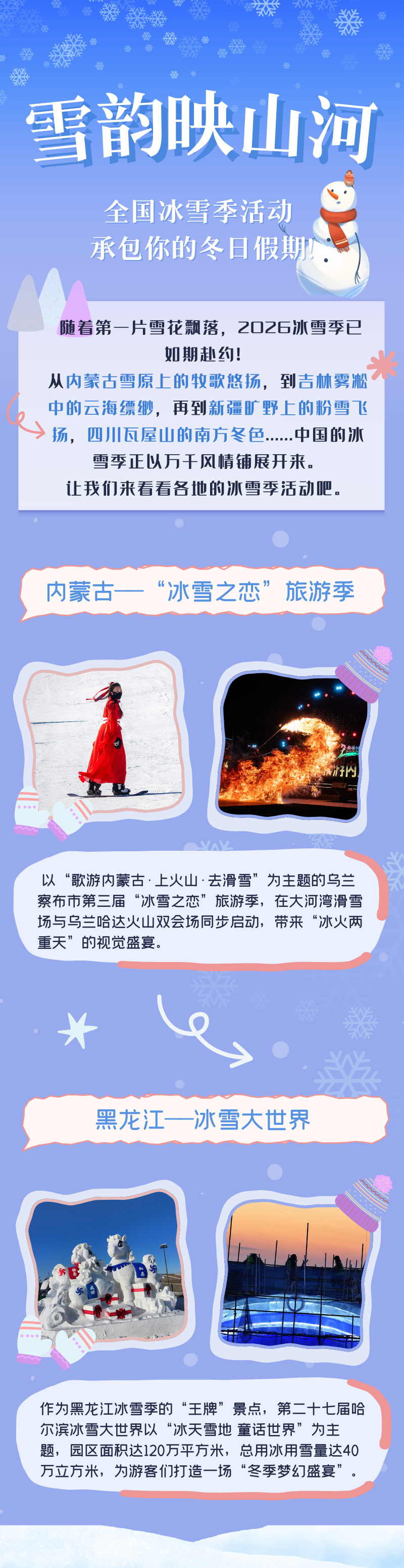 隨著第一片雪花飄落,2026冰雪季已如期赴約。從內(nèi)蒙古雪原上的牧歌悠揚(yáng),到吉林霧凇中的云?~緲,再到新疆曠野上的粉雪飛揚(yáng),四川瓦屋山的南方冬色……中國(guó)的冰雪季正以萬(wàn)千風(fēng)情鋪展開(kāi)來(lái),一起來(lái)看看各地的冰雪季活動(dòng)吧!