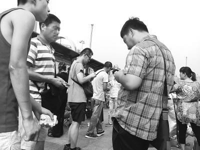 當(dāng)天下午天氣炎熱,每個售票窗口前都有十幾位乘客頂著烈日排隊。在隊尾的人群中,有三四個男女手里各拿著一摞地鐵票,向排隊的人兜售。