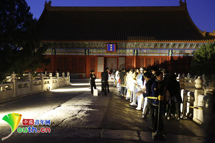 10月11日,故宮武英殿外,觀眾在夜幕中排隊(duì)等候參觀《石渠寶笈》特展,此時(shí)他們至少已經(jīng)等待超過十個(gè)小時(shí)。