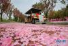 •   4月17日,一夜風(fēng)雨過(guò)后,江蘇南通洲際綠博園櫻花大道上櫻花花瓣飄落一地。 新華社發(fā)(許叢軍 攝)