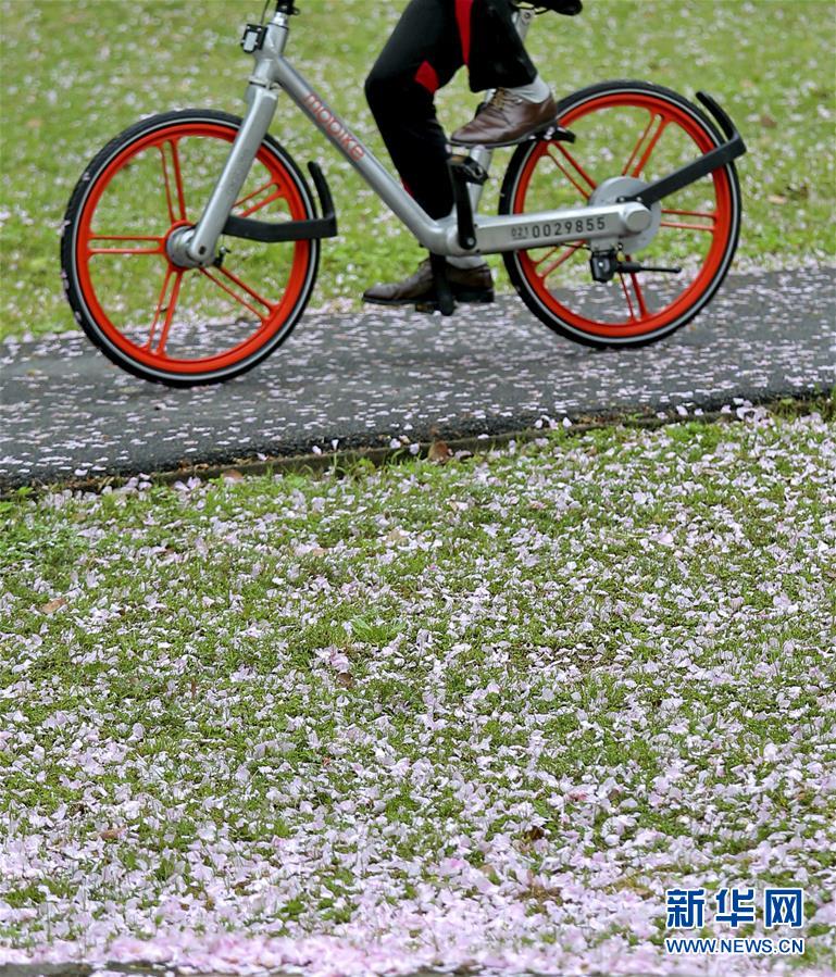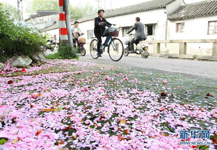 •   4月17日,一場(chǎng)春雨過(guò)后,蘇州市民騎車經(jīng)過(guò)落滿櫻花的盛家?guī)。新華社發(fā)(王建中 攝)