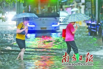 26日下午5時30分,廣州越秀區(qū)東湖西路永勝上沙,暴雨突襲,街坊們小心翼翼地蹚水而過。 南方日報記者 李細華 攝影報道