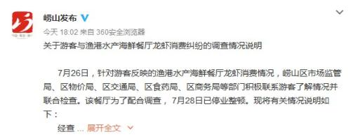 7月26日,針對游客反映的漁港水產(chǎn)海鮮餐廳龍蝦消費情況,嶗山區(qū)市場監(jiān)管局、區(qū)物價局、區(qū)交通局、區(qū)食藥局、區(qū)商務局等部門積極聯(lián)系游客了解情況并聯(lián)合檢查。該餐廳為了配合調(diào)查,7月28日已停業(yè)整頓。有關情況說明如下: