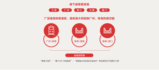 南下避寒、北上玩雪依然是今年春節(jié)最受歡迎的主題游,許多游客選擇去三亞、昆明、廈門等地避寒,或去哈爾濱、長春等地玩雪。從春節(jié)期間國內(nèi)長線游人氣目的地榜單可以看出,避寒游目的地除了海南三亞和云南麗江、大理等地之外,憑借美食、民俗、主題樂園等旅游元素,每年都吸引眾多游客前往過大年的廣州、珠海,今年在人氣榜單上的排名突飛猛進(jìn),其中,廣州一舉進(jìn)入前三甲,珠海也晉級前十強(qiáng)。這背后與廣深港高鐵香港段、港珠澳大橋相繼開通密切相關(guān)。