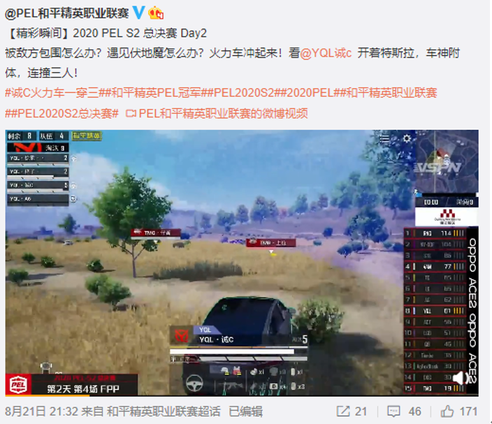 在首周的PEL 2020 S3 常規(guī)賽決賽中,YQL卻成功的浪起了一波又一波的高潮!簡直驚呆了觀戰(zhàn)的小伙伴們!憑借著主力選手誠c的強(qiáng)勢操作,YQL順利在前兩局比賽中吃雞,一舉登頂排行榜首位置。而誠c更是連續(xù)三局獲得MVP,成為PEL首次完成該成就的選手!