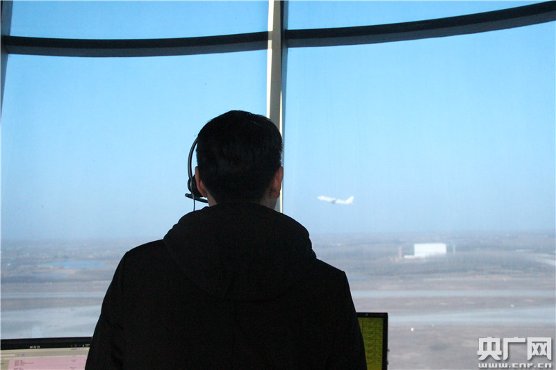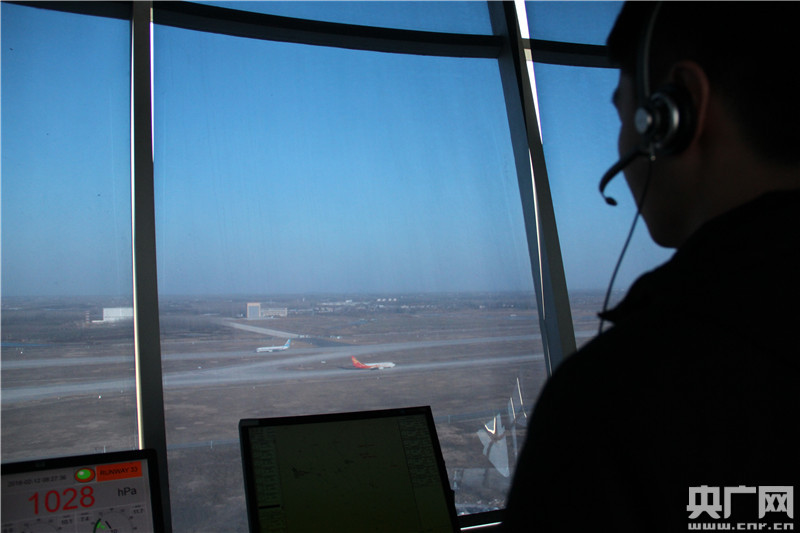 新橋機(jī)場塔臺管制員王俊俊指揮飛機(jī)起降(央廣網(wǎng)記者 高藝寧 攝)