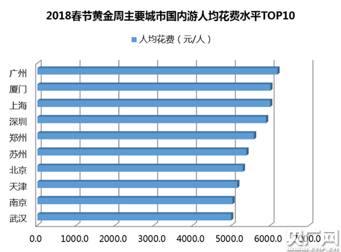 記者根據(jù)上述數(shù)據(jù)報(bào)告還發(fā)現(xiàn),在旅游消費(fèi)水平上,全國游客用于購買旅游產(chǎn)品(交通、住宿、線路等)的人均支出接近4000元/人,相比往年進(jìn)一步提高。其中,春節(jié)黃金周出游人均花費(fèi)水平最高的前十個(gè)城市依次為:廣州、廈門、上海、深圳、鄭州、蘇州、北京、天津、南京、武漢,人均花費(fèi)基本都在5000元/人以上。