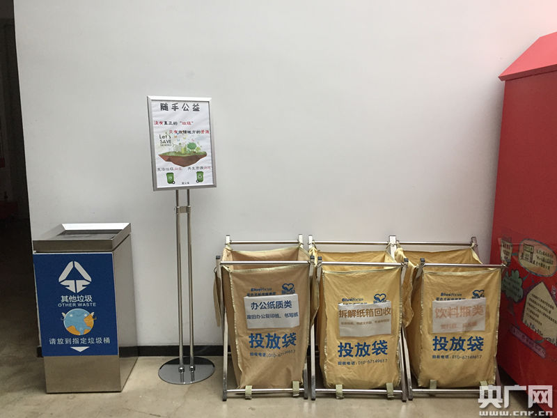 記者在藍色光標參觀時發(fā)現(xiàn),在大樓進出口、電梯口、辦公區(qū)和人群聚集區(qū)域內(nèi),均設(shè)置了不同門類的垃圾投放袋,主要包括白色辦公廢紙類、報紙類、雜志書本類、箱板類、飲料瓶類等。員工也都自覺把垃圾按門類分裝包好才扔進不同的垃圾箱內(nèi)。