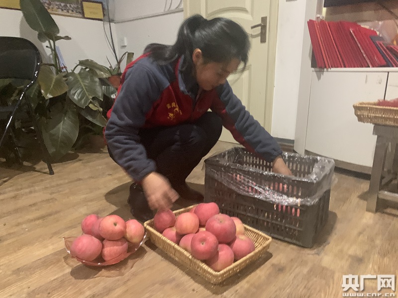 1月20日,牛慶花正在自家倉庫中打包要發(fā)貨的蘋果(央廣網(wǎng)記者孫冰潔 攝)