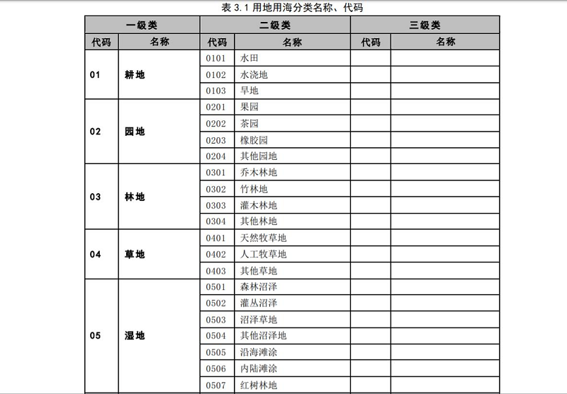 據(jù)記者了解,新出臺(tái)的《分類指南》堅(jiān)持同級(jí)內(nèi)分類并列不交叉、科學(xué)、簡明、可操作的原則,采用三級(jí)分類體系,共設(shè)置耕地、園地、林地、草地、濕地、居住用地、工礦用地等24種一級(jí)類和106種二級(jí)類、39種三級(jí)類。以耕地為例,《分類指南》將一級(jí)類中的耕地分為水田、水澆地、旱地三個(gè)二級(jí)類,并解釋相應(yīng)的含義及代碼。