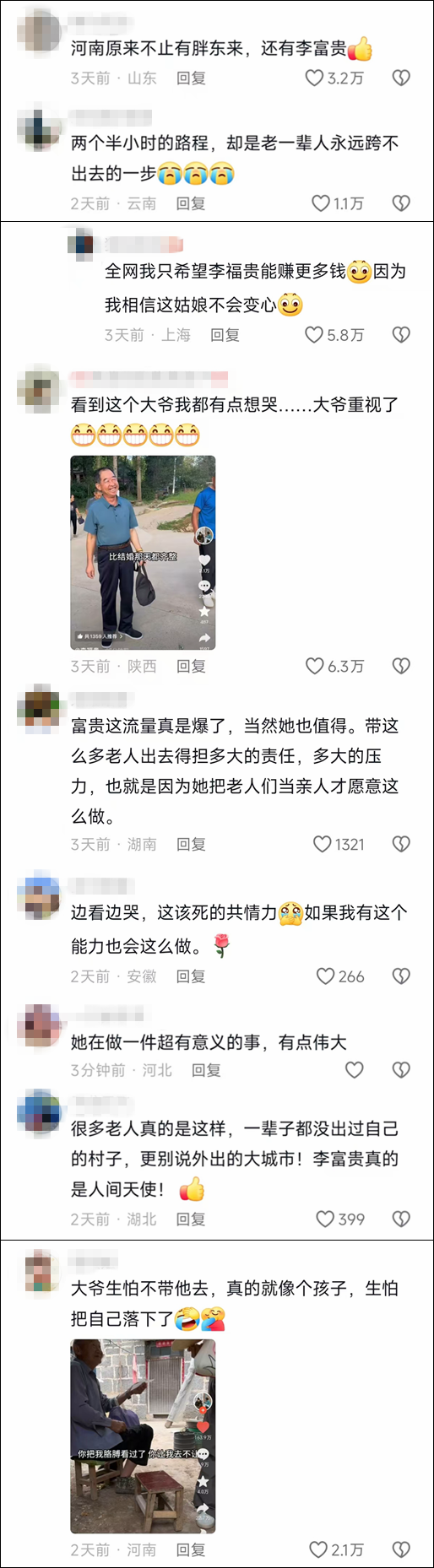 截至8月22日18時(shí)40分,李福貴帶老人出游的視頻已經(jīng)獲得767萬(wàn)點(diǎn)贊,她的短視頻平臺(tái)賬號(hào)粉絲量達(dá)到1032萬(wàn)。