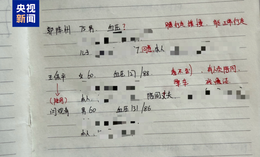 那一天,李福貴統(tǒng)計(jì)了60多人的信息。她在筆記本上寫下每位老人的年齡、身體情況,行動(dòng)自如還是走動(dòng)不便,是否有家人陪同。有腿疼、走路慢,或是聽力不好、暈車的情況,她都一一標(biāo)紅。