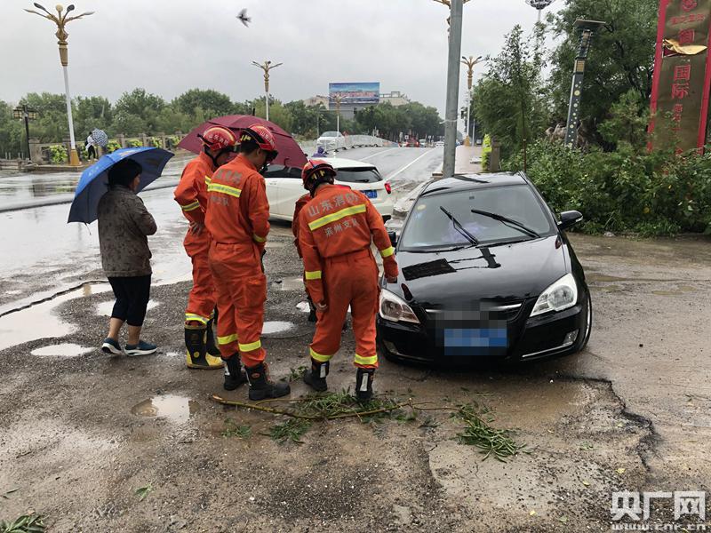 臺風(fēng)致路面塌陷,消防徒手抬車解困(央廣網(wǎng)發(fā) 山東消防供圖)
