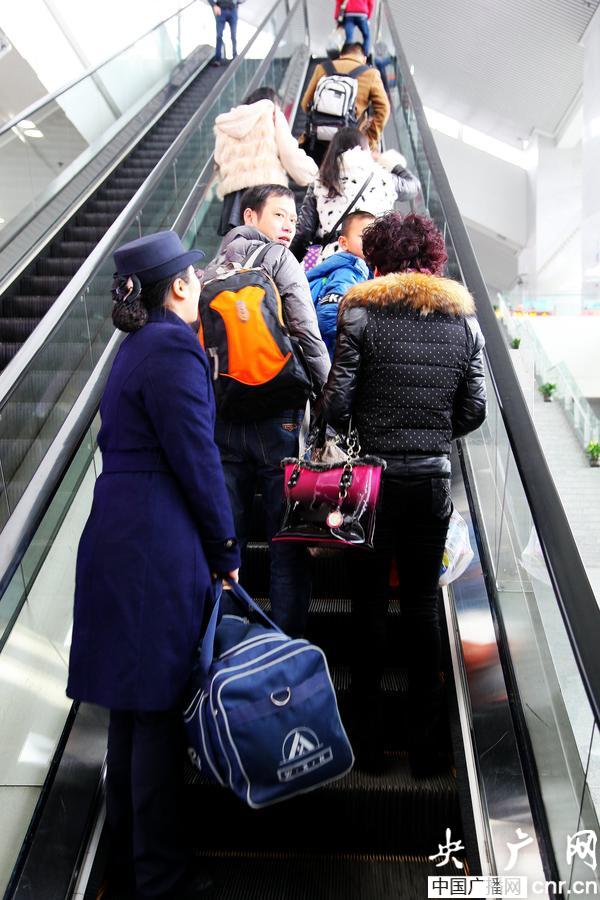 2月13日,離2014年春運(yùn)結(jié)束還有11天,溫州南站的兩層候車室里旅客比高峰期明顯少了很多。赫蕓穿著藍(lán)色的鐵路制服,在一、二層候車室、站臺(tái)之間來回奔忙著。
