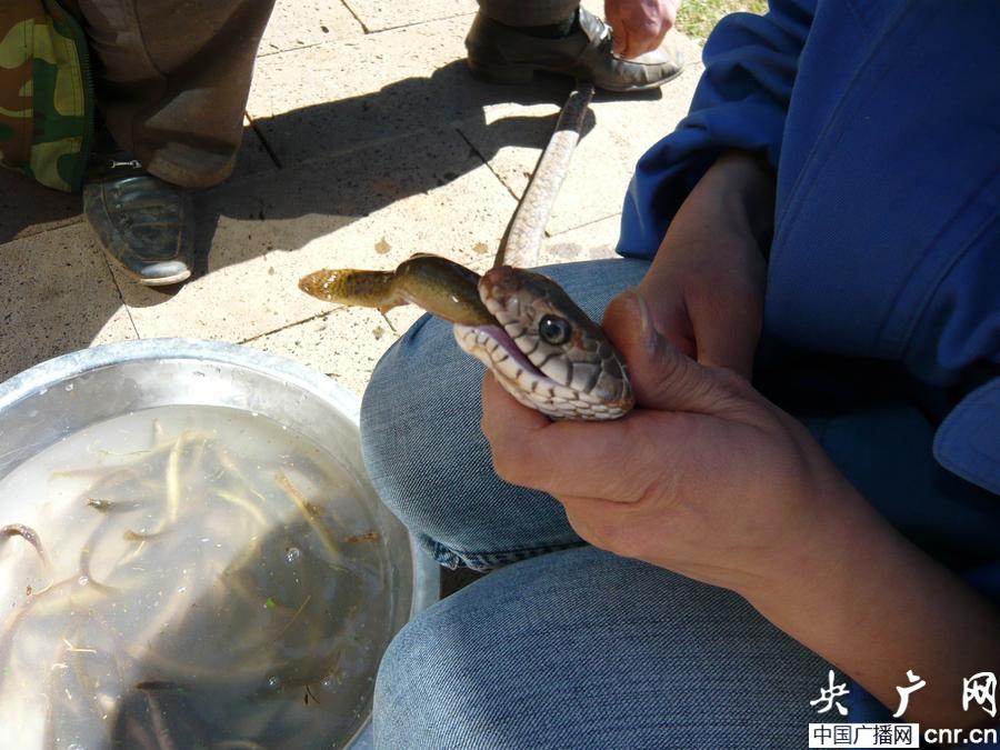 中午11時(shí),工作人員把蛇一條條從蛇園里拿出來,一只手捏著蛇的頭,強(qiáng)迫蛇張開嘴巴,另一只手從旁邊的盆里取出一條活生生的泥鰍來,往蛇的嘴里塞?赡苁呛芫脹]有進(jìn)食,蛇對(duì)送進(jìn)嘴里的食物沒有主動(dòng)進(jìn)食的反應(yīng),有的甚至把食物吐出來。幾名工作人員同時(shí)填食,經(jīng)過一個(gè)多小時(shí),每條蛇填進(jìn)了3條泥鰍,100條蛇終于吃完蘇醒后的第一餐。據(jù)了解,這次喂食的蛇均為無毒蛇。