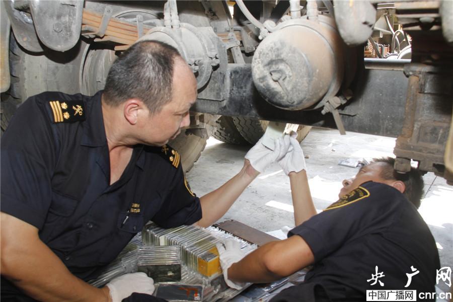 海關(guān)人員從空車橫梁中取出夾藏的走私手機(jī)(央廣網(wǎng)發(fā) 曹瑞達(dá) 攝)