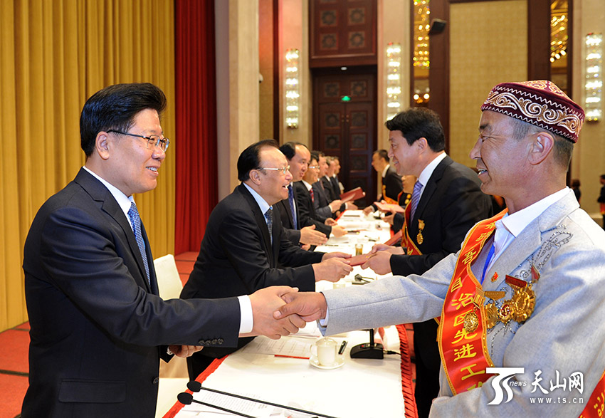 中共中央政治局委員、新疆維吾爾自治區(qū)黨委書記張春賢為2016年先進(jìn)工作者居馬泰·俄白克頒發(fā)榮譽(yù)證書