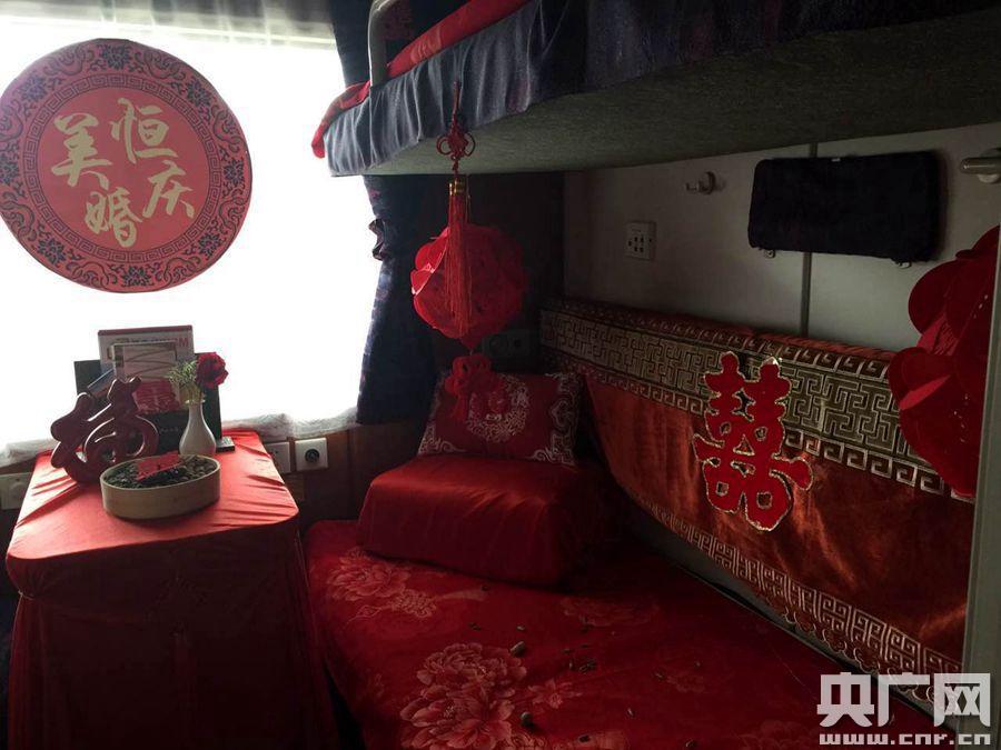 “我們在微信上看見前段日子這趟車上舉辦過婚禮,覺得這樣的婚禮挺個性、挺有紀念意義的,我們就商量在‘5·20’這個特別的日子里用特別的方式來記錄我們的青春!闭劶霸诹熊嚿吓e行婚禮,看著用列車包房裝扮得古色古香的婚房,新郎小張掀起了新娘的紅蓋頭。