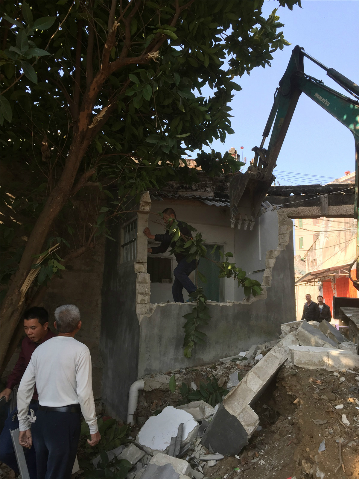 圖為施工人員正在拆除河道兩邊的違章建筑