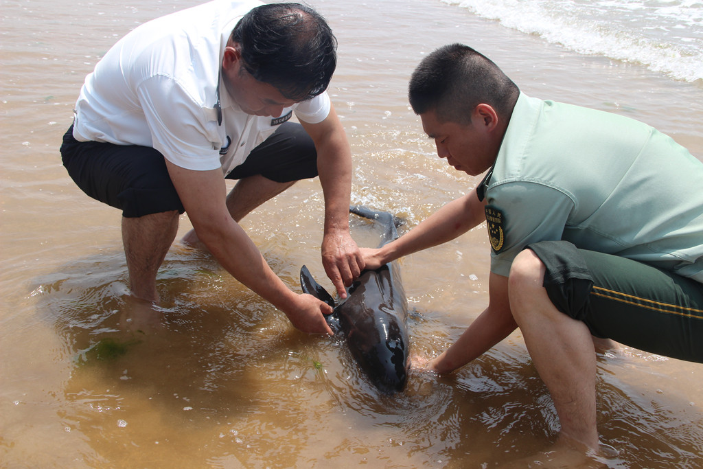 據(jù)介紹,漁民在大辛家附近海域發(fā)現(xiàn)該江豚時,因長時間的擱淺和強(qiáng)紫外線照射,江豚已難以動彈。經(jīng)過相關(guān)救援人員的初步檢查和判斷,這頭江豚體長約1米5,大概一歲左右,身上有輕微的擦傷,但是不會對健康造成影響,符合放生基本條件。對此,派出所民警聯(lián)合海陽漁政工作人員協(xié)力將江豚拖進(jìn)大海放生。