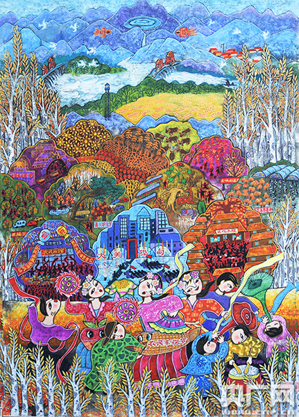 據(jù)中國農(nóng)民書畫研究會會長畢銘鑫介紹,今年全國農(nóng)民畫展的主題為“美麗鄉(xiāng)村 白樺相約”,這是在國家“鄉(xiāng)村振興”的戰(zhàn)略指引下,為了增強(qiáng)農(nóng)民文化的創(chuàng)造力,建設(shè)美麗鄉(xiāng)村致敬新時(shí)代而做出的努力。之所以選在吉林樺甸舉行畫展,是因?yàn)闃宓樵皇谟琛爸袊F(xiàn)代民間繪畫之鄉(xiāng)”,農(nóng)民畫和當(dāng)?shù)剞r(nóng)民的生產(chǎn)生活緊密相連。