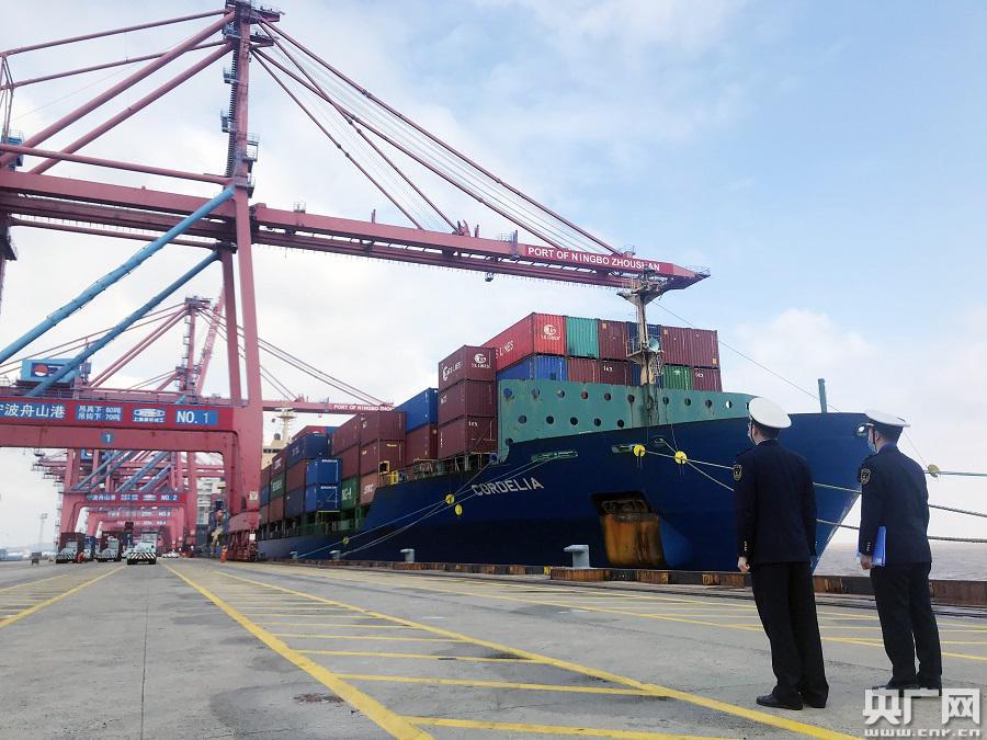 一艘貨輪?吭趯幉ㄖ凵礁奂b箱碼頭(央廣網(wǎng)發(fā) 寧波海事局供圖)