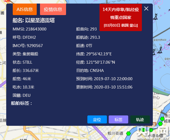 3月10日,剛剛提交進(jìn)港申請的“以星圣洛塔”輪,因系統(tǒng)匹配到它在7天前曾經(jīng)靠泊某疫情嚴(yán)重國家港口,觸發(fā)了“紅碼”提醒。在核對了相應(yīng)信息后,寧波海事局第一時間要求做好船員體溫檢測、控制人員登離,妥善處理船舶產(chǎn)生的生活垃圾和污水,同時將相關(guān)信息通報(bào)引航、港口調(diào)度、船舶代理公司等單位,落實(shí)相應(yīng)防范措施。