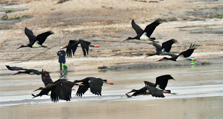 黑鸛種群在武漢天興洲越冬棲息(央廣網(wǎng)發(fā) 武漢市觀鳥協(xié)會供圖)