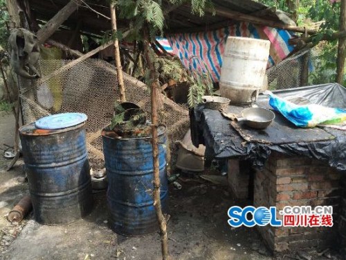 “早上去的時候,油鍋里正熬著地溝油!睋(jù)洪雅縣公安局治安大隊黃大隊介紹,前期食藥監(jiān)局已經(jīng)對該窩點進行過排查蹲守。今日早上10點,工作人員前去該窩點檢查,現(xiàn)場看到幾個用磚砌的四角缸里放著大量餐館臊水雜物,七七八八的油桶擺放在墻邊,油鍋里正熬著地溝油,并無人看管,該窩點也只有萬某某和他的妻子 。通過檢查,現(xiàn)場工作人員共查獲了9桶地溝油。
