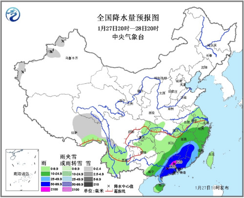 27日20時至28日20時,新疆西部、西藏東部等地的部分地區(qū)有小到中雪或雨夾雪;江南中東部、華南中東部等地有中到大雨,其中,江西南部、福建西部、廣東等地的部分地區(qū)有暴雨,局地有大暴雨(100~120毫米)。黃海南部、南海東北部和東南部、東海大部海域將有6~7級、陣風8級風。