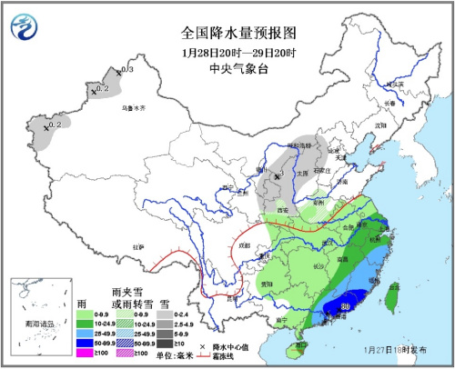28日20時至29日20時,新疆西部、西北地區(qū)東部、華北西部等地有小到中雪或雨夾雪;西南地區(qū)東部、江漢、江淮、江南、華南大部等地有小到中雨,其中,浙江南部、江西南部、福建、廣東大部等地的部分地區(qū)有大雨,局地有暴雨(50~80毫米)。山東半島、遼東半島等地有4~5級風。